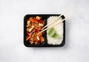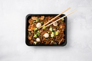 Zasmażany makaron z warzywami z dodatkiem sosu sojowo-grzybowego i białego pieprzu z mięsem. Główny składnik do wyboru.