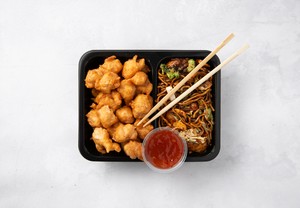 Chrupiące kawałki kurczaka smażone w cieście podawane z sosem sweet-chili. Możliwość zamiany ryżu na makaron.