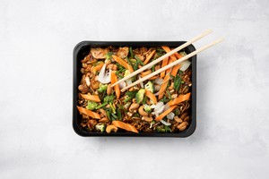Pszenny chiński makaron zasmażany z warzywami, sezamem oraz orzechami ziemnymi na woku. Główny składnik do wyboru.