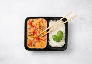 Bardzo ostre danie na bazie mleka kokosowego z dodatkiem czerwonej pasty curry, podawane z czerwoną papryką, marchewką i fasolką szparagową.