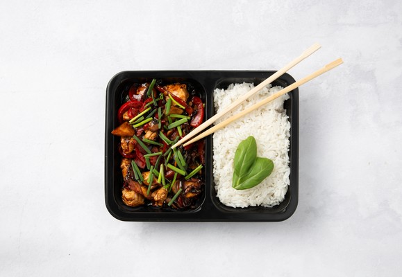 Danie na bazie czosnku, czerwonej papryki, grzybów mun oraz pieczarek smażone na woku na sosie ostrygowym. Główny składnik do wyboru. Możliwość zamiany ryżu na makaron.